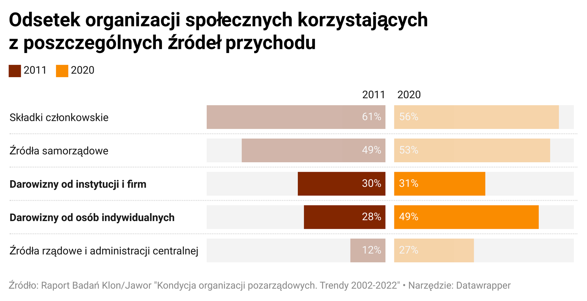 «У нас недостаточно финансовых ресурсов, а сложные формальности, связанные с получением грантов, могут оказаться непосильными». Звучит знакомо? Вполне возможно, потому что на протяжении более двадцати лет нехватка средств и слишком много формальностей были наиболее часто упоминаемыми проблемами неправительственных организаций в Польше (Raport Badań Klon/Jawor „Kondycja organizacji pozarządowych. Trendy 2002-2022”).